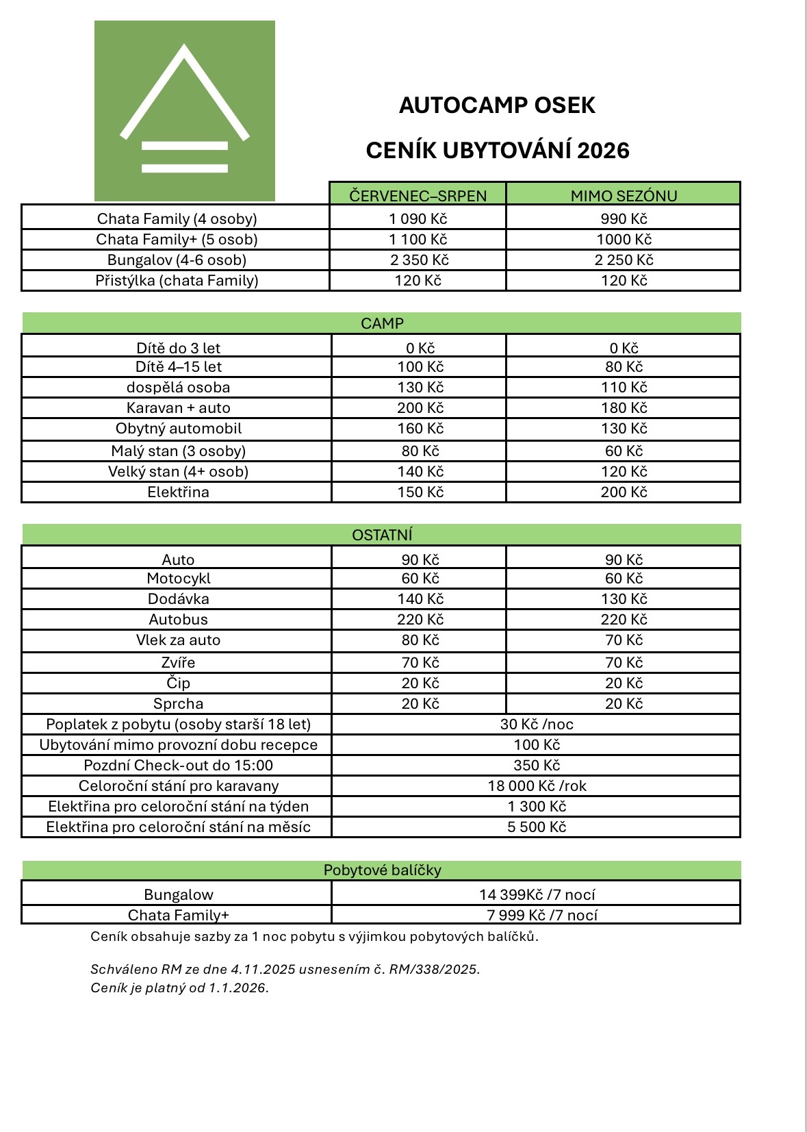 Provozní doba kempu v roce 2025 je od 18.4.2025 do 31.10.2025. Zvolte si prosím období Vašeho pobytu.